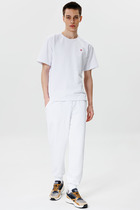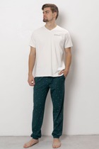 Мужские брюки из футера с лайкрой. Прямой покрой, по бокам карманы, спереди оригинальный принт, пояс на резинке со шнурком. На манжетах