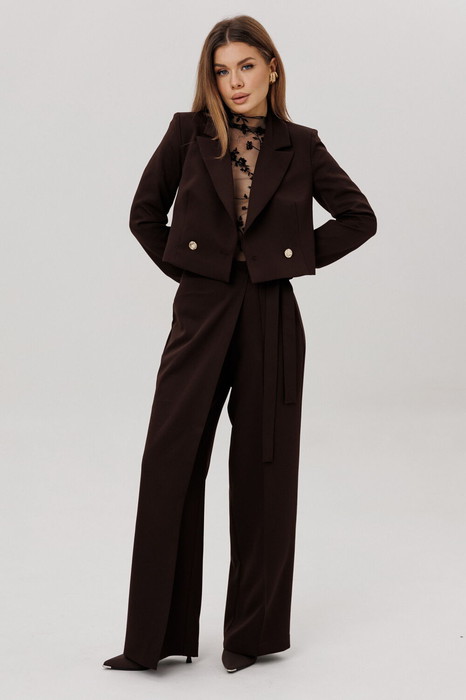 Брюки прямого силуэта с имитацией запаха на притачном поясе. По переду застежка на тесьму-молнию. По боковым действующие карманы.