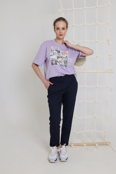 Джинсоые брюки темно-синего со складочками спереди, боковами карманам и манжнтами по низу. Изделие имеет среднюю посадку.
