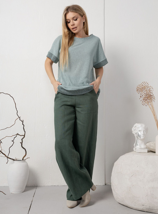 Очень комфотртные и модные льняные брюки с карманами в боковых швах и на резинке по талии.