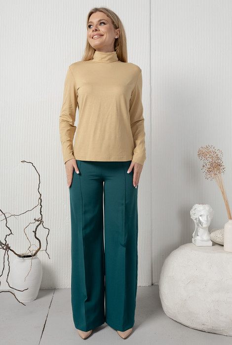 Облегающие широкие брюки с высокой талией. Изделие имеет защипы-канты по передней и задней половинке. Застежка на потайную молнию в боковом шве.