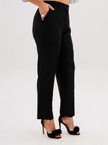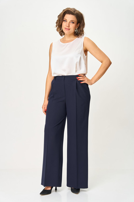 Брюки классические, со стрелками, полной длины, выполнены из однотонной ткани. В области бедер полуприлегающие, в колене и по низу прямые. По передним половинкам обработаны складки по линии талии и наклонные карманы, в среднем шве застежка на молнию. По задним половинкам обработаны талиевые вытачки. Брюки на притачном поясе с эластичной тесьмой и застежкой на петлю и пуговицу.