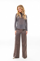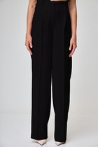 Зауженные книзу за счёт вытачек по передним и задним частям. На передних частях брюк обработаны карманы с отрезным бочком.