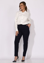 Брюки прямого кроя выполнены из костюмной ткани черного цвета. Характеристики: прямой крой, широкая резинка 7 см из основной ткани, боковые карманы, на передних и задних частях брюк заутюжены стрелки. Длина брюк 109 см.