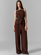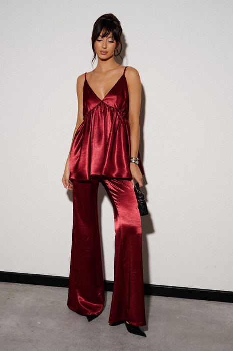 Брюки прямого свободного кроя. Выполнены из мягкой струящейся ткани бордового цвета. Пояс на резинке. Карманов нет. Длина 109 см