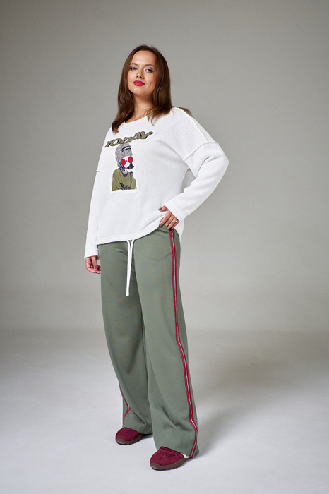 Джоггеры из плотного, но пластичного трикотжа, прямого силуэта, с боковыми карманами спереди, и фигурной кокеткой сзади.  Пояс с резинкой. В  боковых швах  лампасы из отделочной тесьмы.