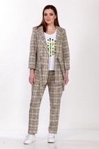 Брюки классические, прямые, слегка заужены к низу,заутюжены стрелки, по переду обработаны карманы с отрезным бочком, застежка на тесьму-молнию и 1 пуговицу. На задних половинках обработаны вытачки и имитация карманов с листочкой, пояс в брюках притачной. Длина брюк от талии по боковому шву 103 см.