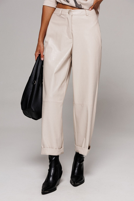 Брюки их эко-кожи немного заужены к низу. На притачном поясе со шлёвками, застежкой-гульфик. Пояс застегивается на петлю-пуговицу. По переду рельефы и карманами в них. По спинке вытачка от пояса. По переду и спинке брюки отрезные по лини колен.