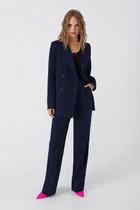 Стоит учитывать слабую растяжимость ткани и зауженность модели в бедрах.