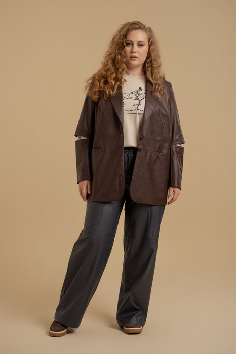 Брюки женские прямого силуэта из искусственной кожи на хлопковой основе. Пояс - отрезной с эластичной тесьмой и застежкой на брючный крючок. В боковых швах - карманы с отрезными бочками. Изделие декорировано подрезами. Есть шлевки для ремня.