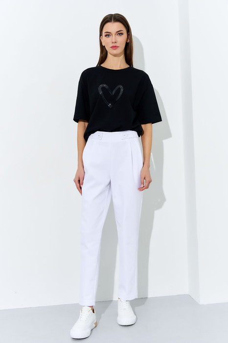Брюки женские полуприлегающего силуэта из джинсовой ткани. По переду обработаны односторонние складки. По застроченным складкам проложена отделочная строчка. Спинка с талевыми вытачками. В боковом шве обработана застежка на потайную тесьму «молния». Верхний срез брюк обработан обтачкой. Полупояс продевается через настроченные шлевки и застегивается на пуговицы на переде. Низ брюк обработан швом в подгибку в чистый край.