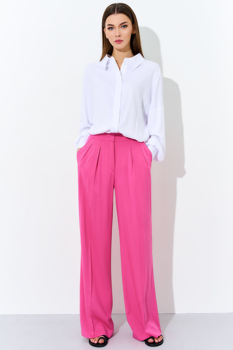 Брюки женские широкие прямого силуэта, выполнены из ткани платьево-костюмного ассортимента.по переду заложены две складки и обработаны карманы "хулиганы". Пояс прямой, застежка на потайные крючки и потайную петлю с пуговицей. Низ брюк подшит швом вподгибку с закрытым срезом.