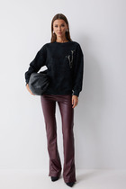 Модель свободного силуэта со значительным клешением брючин от линии бёдер и талией, акцентированной поясом из основной ткани.