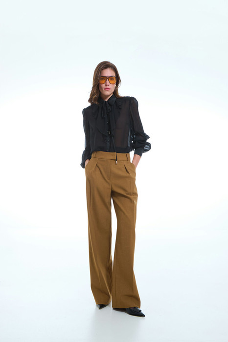 Брюки женские длинные, прямые со стрелками. Передние половинки с боковыми наклонными карманами и складкой с 42 по 48 р-ры. По задним половинкам фиктивный карман с «клапаном и двумя обтачками». Брюки застегиваются на молнию, крючок и пуговицу.