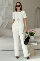 Брюки выполнены из сетки с рисунком. Брюки прямого силуэта, длиной в пол, на притачном поясе с эластичной тесьмой.