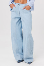 Джинсы-багги выполнены из плотного джинса. Брюки на притачном поясе, длиной до линии щиколотки, расширенные от бедер и слегка зауженные к низу. Спереди боковые карманы с фигурным входом. Застежка на пуговицу и молнию с гульфиком. На задних частях кокетки и накладные карманы. На передней и задней части коленные вытачки.