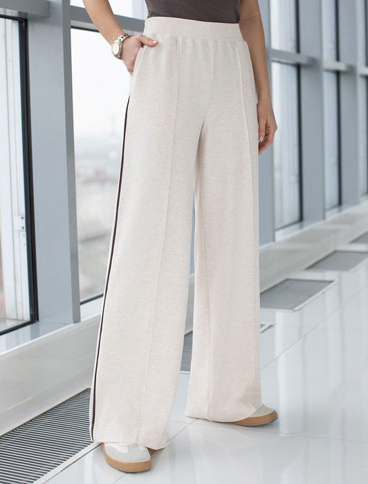 Состав: 95%Хлопок 5%ПУ Плотность: 240 Г/м2Брюки выполнены из эластичного футера двухнитки. Изделие свободного кроя дополнено трендовыми лампасами кофейного цвета и боковыми карманами. Эластичный пояс на резинке с потайным шнуром.