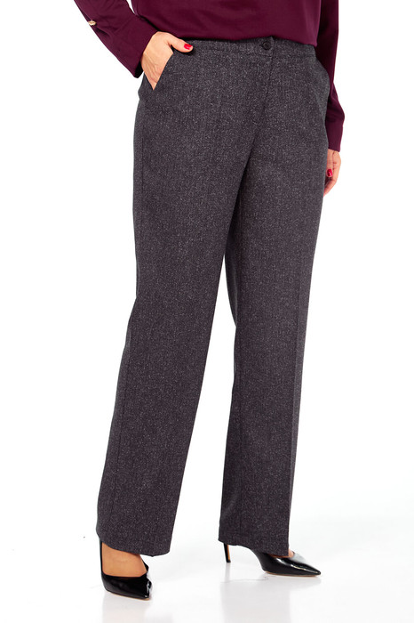 Брюки женские, выполнены из костюмной ткани, пояс притачной частично на резинке. Застежка на тесьму-молнию и петлю-пуговицу. В брюках обработаны карманы.