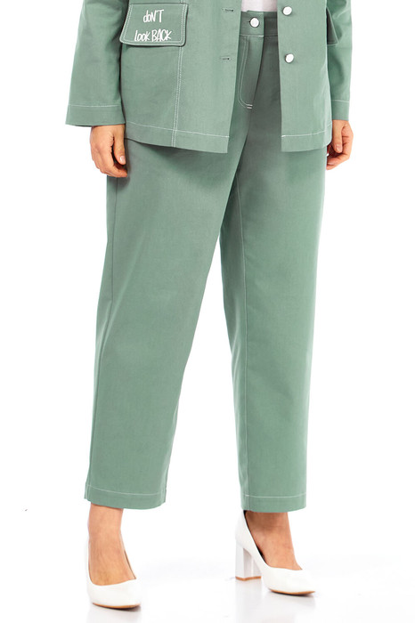 Брюки свободного силуэта слегка заужены к низу. Пояс притачной, частично на эластичной тесьме, с застежкой на петлю и пробивную пуговицу. По переду обработаны карманы с листочкой и подрезным бочком.