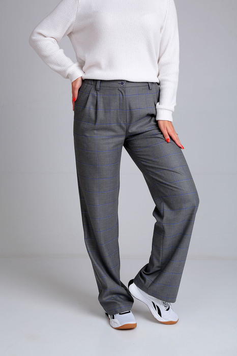 Брюки прямого кроя. Передние половинки брюк с двумя складками по переду и застёжкой по типу «гульфик». Верхний срез брюк обработан притачным поясом со шлёвками, по бокам вставлена резинка. В боковых швах карманы «хулиганы».
