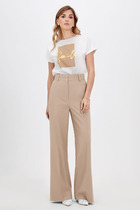 Брюки прямого силуэта расширенные книзу из костюмной ткани. По верху брюк  притачной пояс с застежкой на петли и пуговицы. На передних половинках обработана застежка молния в среднем шве. На передних половинках карманы и декоративные складки. По поясу задних половинок брюк резинка и вытачки. Обращаем ваше внимание, что фурнитура может отличаться от фото.
