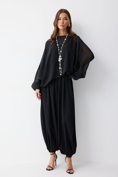 Брюки шаровары свободного, расширенного силуэта, по низу со сборкой. Из струящейся ткани. Пояс с резинкой. По низу манжеты с резинкой.