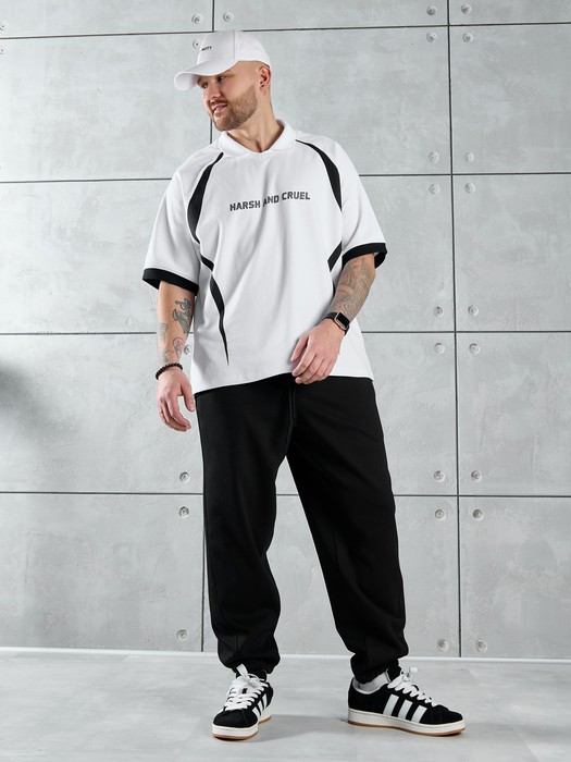 Брюки мужские из трикотажного полотна "лининг" свободного покроя, со смещенными к центрам передних половин боковыми швами, карманами в боковых швах и притачным поясом с эластичной тесьмой внутри. Нижние срезы обработаны подгибкой с эластичной тесьмой. Для регулирования степени прилегания изделия по талии предусмотрен шнурок, вставленный через две обметанные петли в центре пояса спереди.