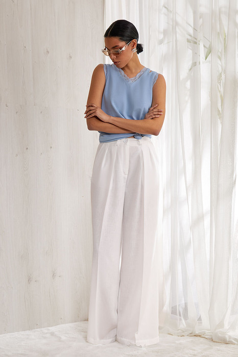 Прямые брюки-палаццо из тонкого льна с вискозой. Брюки на поясе. Функциональные прорезные карманы в рамку в боковых швах. Сзади прорезные карманы в рамку – обманки. По переду по две глубокие односторонние складки.