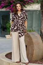 Детали: высокая посадка, притачной пояс со шлевками, передние половины с небольшими застроченными мягкими складками и заутюженными стрелками, застежка на молнию и пуговицу, боковые карманы. Задние части брюк с вытачками и заутюженными стрелками. Пояс брюк прямой, без резинки.