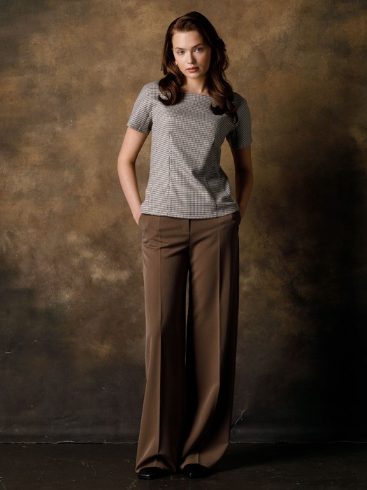 Модель прямого силуэта, на подкройном поясе, со шлёвками. Спереди карманы в подрезных бочках. Застёжка на молнию и крючки на поясе. Сзади прорезные карманы в рамку с фигурным клапаном-петлёй, который застёгивается на пуговицу.
