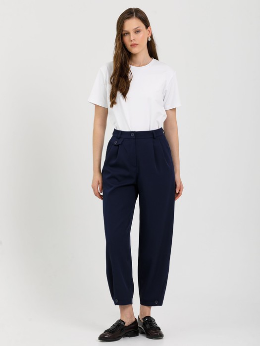 Модель зауженная к низу, на притачном поясе, со шлёвками. Сзади пояс собран на резину. Спереди по талии защипы и декоративный клапан с пуговицей. Застёжка на молнию и пуговицу на поясе. В подрезных бочках карманы. По низу брюк застроченные защипы и декоративные пуговицы. Ремень в комплект не входит.