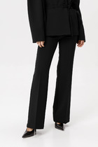 Модель прямого силуэта, на подкройном поясе, со шлёвками. Пояс частично собран на резину. Застёжка на молнию, потайную пуговицу и крючки на поясе. Спереди карманы в подрезных бочках. Сзади прорезной карман в рамку с клапаном. Ремень в комплект не входит.