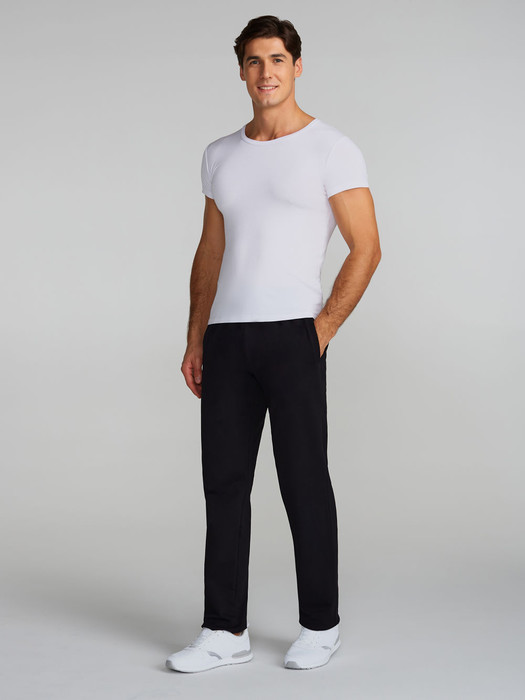 Брюки мужские из хлопкового трикотажного полотна. Карманы выполнены в боковых швах без молний. Пояс по талии регулируется шнурком.