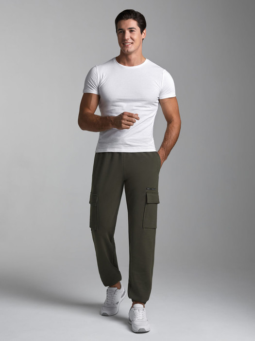 Брюки мужские из хлопкового трикотажного полотна в стиле "карго". Верхние карманы прорезные с листочками. Ниже по бокам брюк есть дополнительные объемные накладные карманы с клапанами. Низ брюк присобран на эластичную резину. Пояс по талии регулируется шнуром.