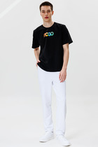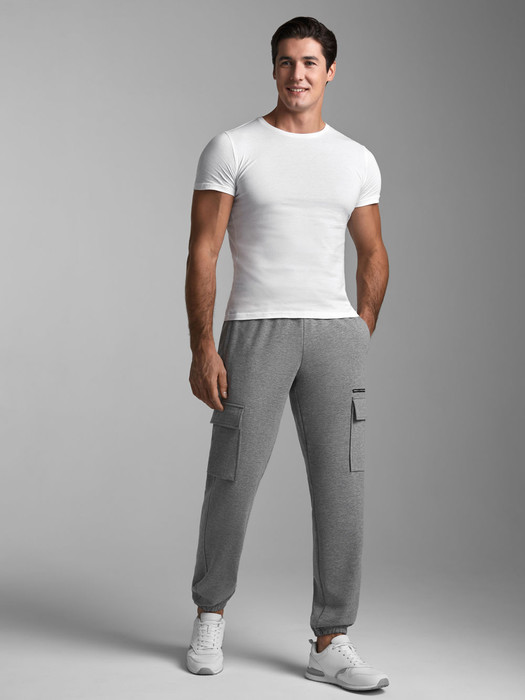 Брюки мужские из хлопкового трикотажного полотна в стиле "карго". Верхние карманы прорезные с листочками. Ниже по бокам брюк есть дополнительные объемные накладные карманы с клапанами. Низ брюк присобран на эластичную резину. Пояс по талии регулируется шнуром.