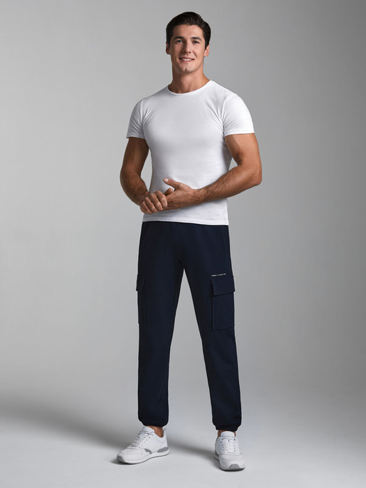 Брюки мужские из хлопкового трикотажного полотна в стиле "карго". Верхние карманы прорезные с листочками. Ниже по бокам брюк есть дополнительные объемные накладные карманы с клапанами. Низ брюк присобран на эластичную резину. Пояс по талии регулируется шнуром.