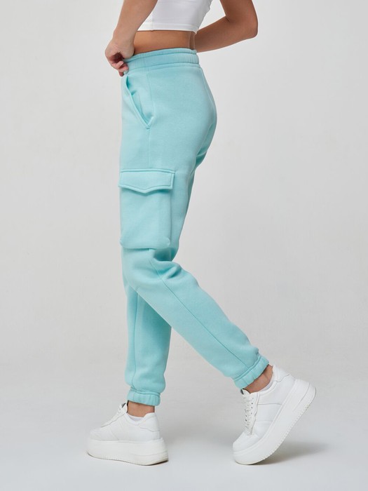Брюки женские "карго" из плотного и мягкого хлопкового трикотажного полотна с изнаночным начесом. Карманы верхние прорезные с бочком. Есть дополнительные боковые накладные карманы, объемные, с клапанами. Низ брюк заужен и присобран на манжету с эластичной резиной. Пояс брюк дополнительно регулируется шнуром.