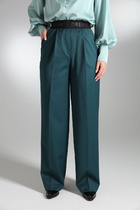 Брюки женские из костюмной ткани. Посадка- средняя. Слегка заужены к низу, с наклонными карманами и регулируемым резинкой поясом. Застегиааются на молнию по переду и одну пуговицу.