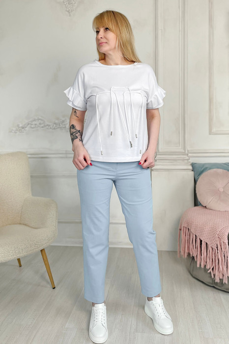 Брюки женские из хлопкового джинса со стрейчем. Брюки с высокой посадкой. Карманы сзади и спереди. Пояс притачной. По спинке расположена резинка.
