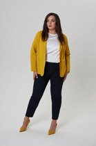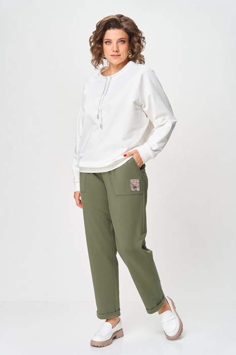 Брюки женские из трикотажной ткани (двунитка), слегка заужены к низу. По переду брюк расположены накладные карманы. На левом кармане  настрочной декоративный элемент. В пояс вставлена резинка по кругу.