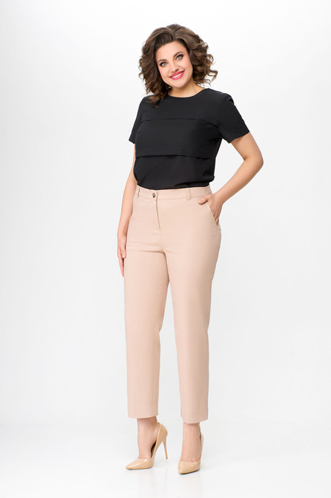 Брюки женские прямого силуэта. Выполнены  из турецкого денима. Брюки - с притачным поясом и резинкой по спинке. По переду  обработаны боковые карманы. Застёжка -  на тесьму-молнию и пробивную пуговицу. По задним половинкам  брюк расположены накладные карманы.  Длину брюк можно регулировать подворотом.