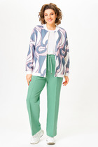 Брюки женские спортивного стиля из эластичного хлопкового полотна, прямого от бедра кроя. По передним половинкам брюк расположены фигурные карманы. По передним и задним половинкам отсрочены канты. Пояс брюк притачной с эластичной тесьмой-резинкой, в передней части пояса вставлен декоративный шнурок с металлическими наконечниками.