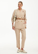 Брюки классической формы, зауженные к низу со стрелками по передним и задним половинкам. По низу брюк манжеты. Верхний срез брюк обработан поясом с резинкой по боковым швам. На задних половинках расположены талиевые вытачки, в боковых швах – наклонные карманы. Перед обработан поясом фигурной формы и декоративным клапаном, на котором пришита пуговица. В комплект входит контрастный узкий ремень.