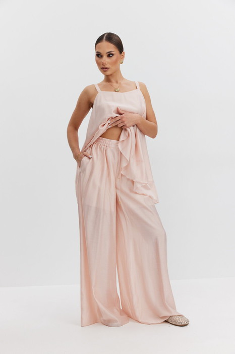 Брюки женские свободного силуэта из полупрозрачной ткани вуаль, высокая посадка, брюки на резинке, пояс притачной со шнуром, боковые карманы в швах. В брюках предусмотрена подкладка в виде шорт