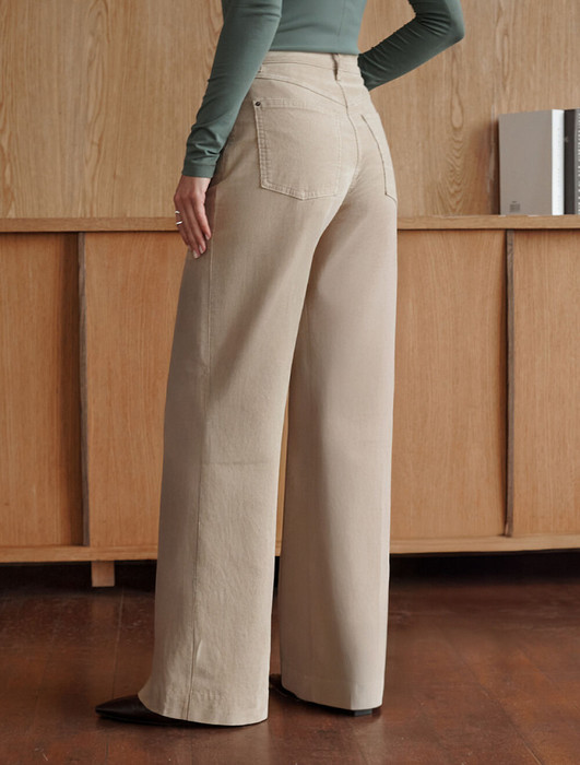 Брюки свободного кроя трубы выполнены из мягкого хлопкового микро-вельвета с добавлением эластана. Изделие комфортно садится по фигуре и не сковывает движения. Модель с пятью карманами, как у джинсов дополнена высококачественной фурнитурой с фирменным логотипом бренда. Идеально впишутся в повседневный образ, со свитером крупной вязки, курткой-косухой, ботинками на грубой подошве, челси и казаками.