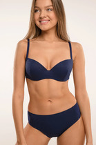 Бюстгальтер выполнен из гладкого материла в полоску с отделкой ажурным кружевом. Формованные чашки на косточках, с Push-up для размеров 70AB, 75ABC, 80B и без Push-up для paзмеров 70C, 75DE, 80CDE, 85BCD. Центральная часть декорирована атласным бантиком. Бретели съемные, регулируемые.Можно подобрать в комплект Трусы стринг, Трусы боксер.