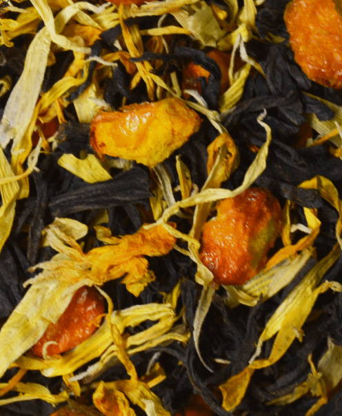 Купаж из классических черных индийских чаев с добавлением сублимированной облепихи, листьев смородины и лепестки календулы.  Содержит пищевые ароматические масла.
