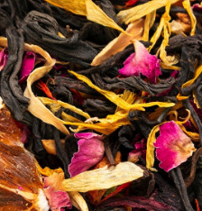 Индийский байховый чай, лепестки розы, календула, каркаде, кожура шиповника, лепестки сафлора, цветки апельсинового дерева, кусочки сушеного яблока, цукаты манго, цукаты папайя, сегмент апельсина. Содержит пищевые ароматические масла.;