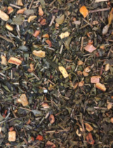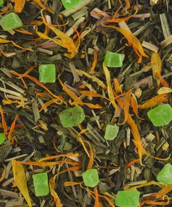 СОСТАВ: чай зеленый сенча, женьшень улун, лимонная трава, имбирь, цукаты, вишня, календула лепестки, аромамасла.