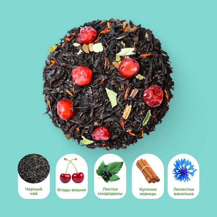 василёк лепестки, вишня ягоды, корица, смородина листья, чай черный